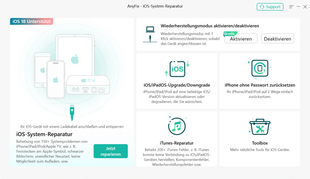 AnyFix innovatively offers three repair modes that you can choose from depending on the severity of your problem. It makes every effort to ensure you can fix the system issue on your iPhone, iPad, iPod touch, or Apple TV with the highest success rate to date.