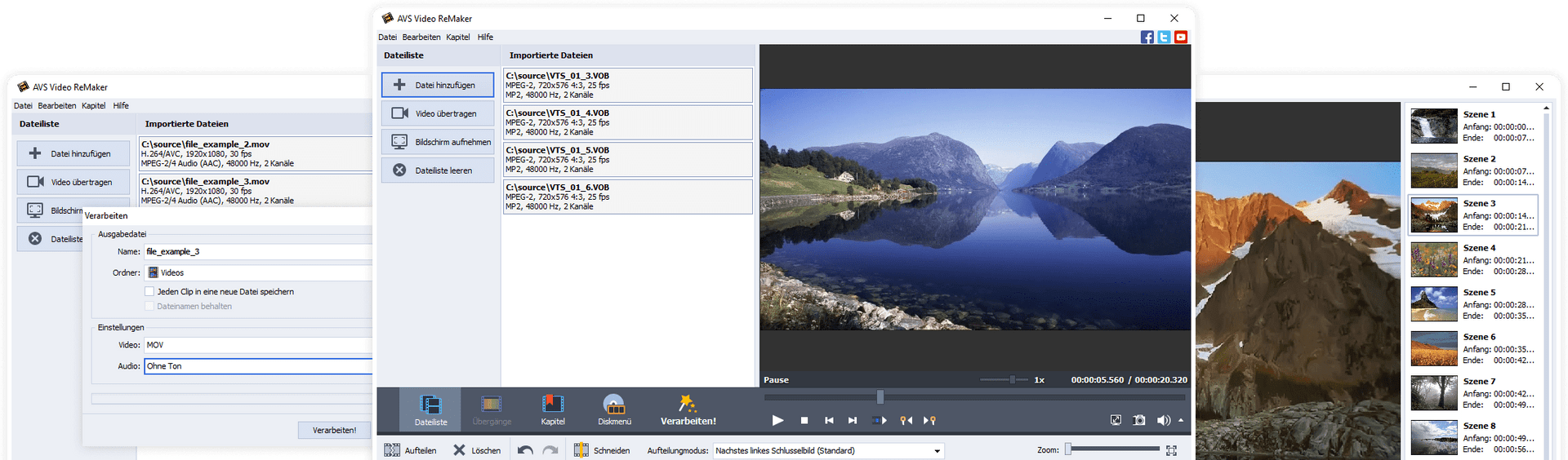 Trim and delete unwanted scenes or change the scene order in all popular video formats.