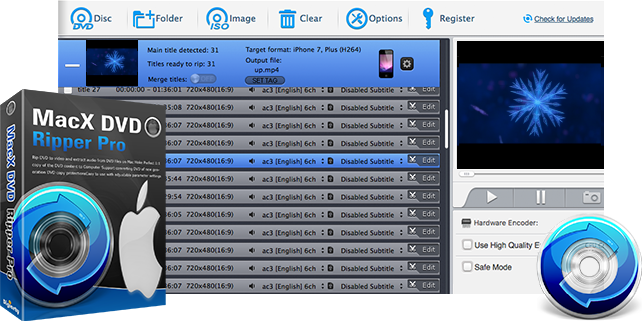MacX lets you rip any DVD on Macbook Pro, Air/iMac to Apple-specific MP4, MOV, H.264, HEVC that are compact and playable on iPhone, iPad Pro/Air/Mini, iPod & Apple TV.